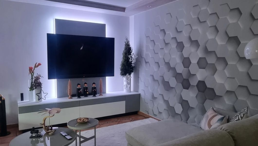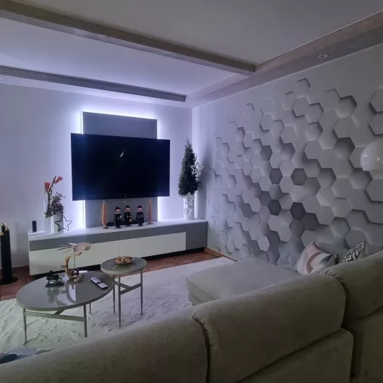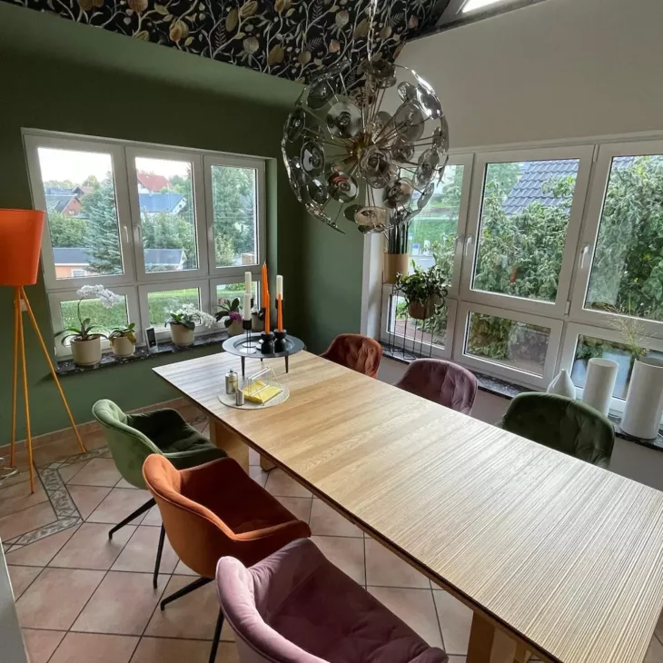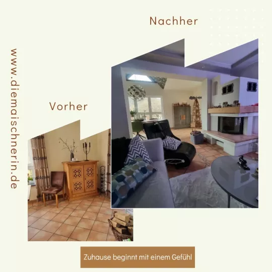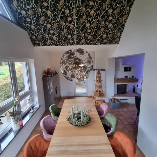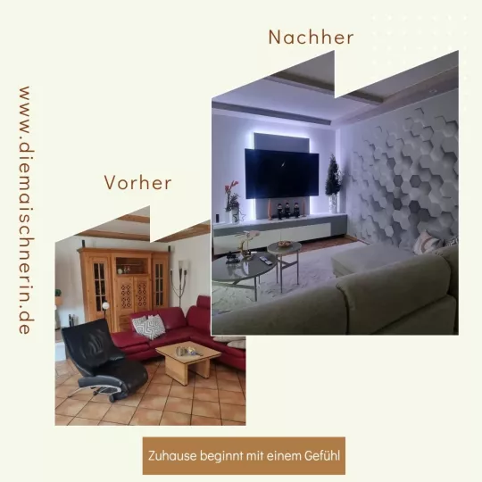 Beim ersten Kennenlernen war sofort klar: Wir brauchen kein Zufalls-Shopping, sondern ein klares Bild. Ich habe zugehört, skizziert, Farben und Materialien gedacht – und Schritt für Schritt ein neues Zuhause-Gefühl aufgebaut. Wir haben Liebgewonnenes bewahrt und zugleich mutig erneuert: Holzdeckenbalken und Kamin erhielten ein helles Finish, die Raumaufteilung wurde geöffnet, Couch und TV bekamen eine neue Achse. Das Ergebnis: ein ruhiger, natürlicher Wohnbereich mit handgefertigtem TV-Board – und ein Essbereich mit Farbe, Struktur und Licht, der die Geschichten des Hauses weiterschreibt. Ein besonderes Highlight sind die 3D-Tapete im Wohnraum und die Designtapete im Dachspitz des Esszimmers. „Jetzt kommen wir nach Hause und entspannen sofort“, so das Fazit. Genau so soll es sein.